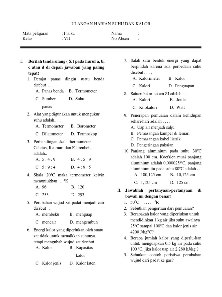 Soal Uh Ipa Kelas 7 Semester 1 Bab Kalor Dalam Perubahan Wujud Benda
