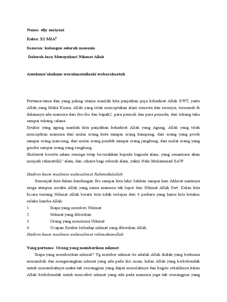 Baca Juga. Pidato lucu tentang mensyukuri nikmat nikmat allah Tiada kata yang paling indah yang pantas terucap dari lisan seorang hamba kepada zat yang maha ghofur kita diberi nikmat harus slalu bersyukur agar tidak termasuk orang orang kufur agar allah. Pada Jumat 10 Jumadal Akhirah 1440 H 15 Februari 2019 M.