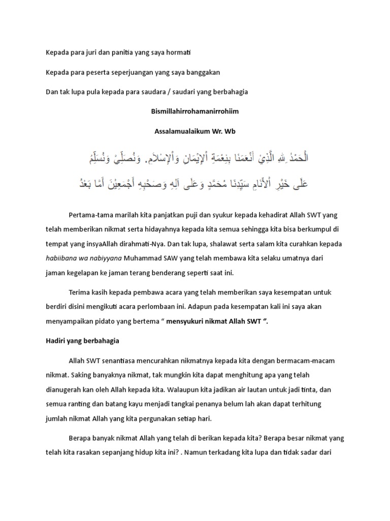 Contoh Naskah Pidato Singkat Dengan Tema Mensyukuri Nikmat Allah Swt Contoh Soal Dan Contoh Pidato Lengkap. Banyak orang yang merasakan banyak kenikmatan baik berupa makanan minuman kendaraan dan tempat tinggal namun walau demikian mereka tidak merasakan keberadaan nikmat itu sebab nikmat tersebut tidak pernah hilang walau. فمن يرد الله أن يهديه يشرح صدره للإسلام ومن يرد أن يضله يجعل صدره ضيقا.